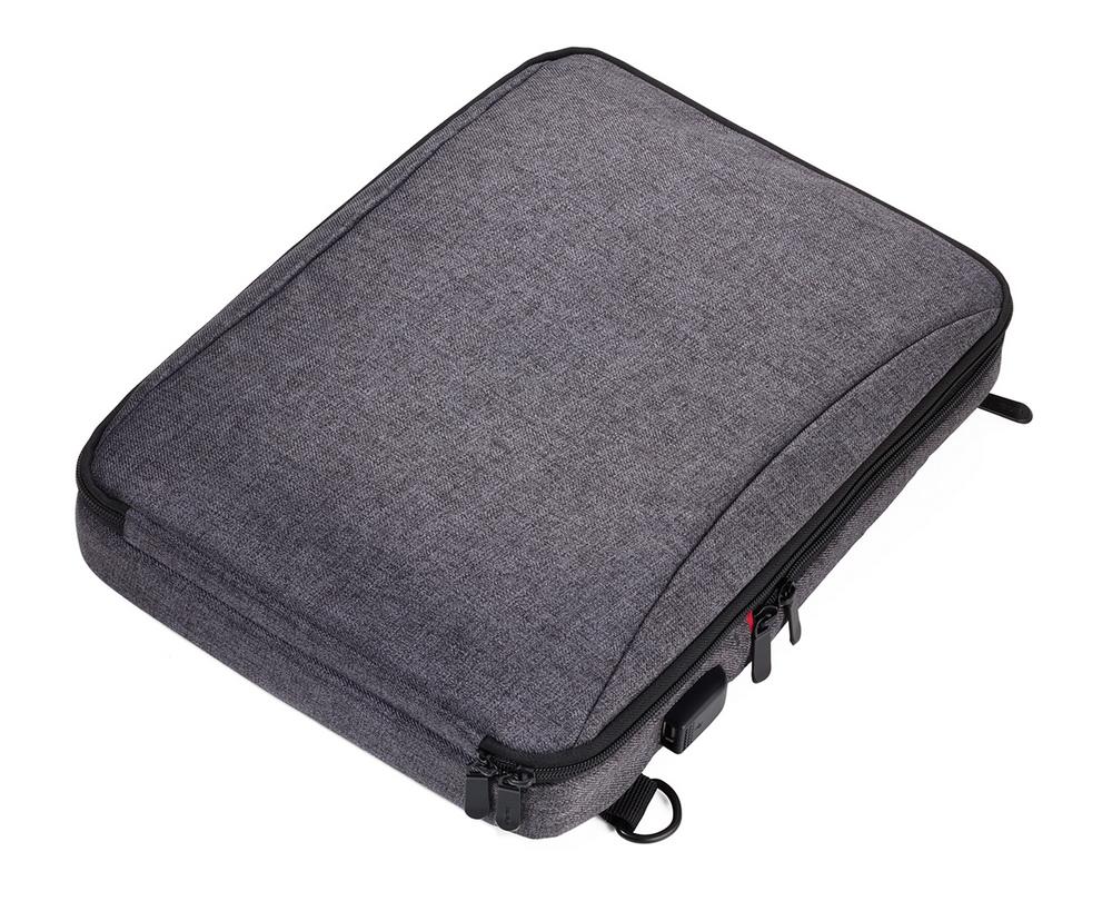 1 отделение для документов, ноутбука, планшета (до 13 дюймов), 1 отделение на резинке для аксессуаров (повседневная переноска), 1 отделение на спине, складное, мягкие плечевые ремни, эластичная петля для крепление к тележке, встроенный USB-кабель, вход + выход, полиэстер, антрацит / черный