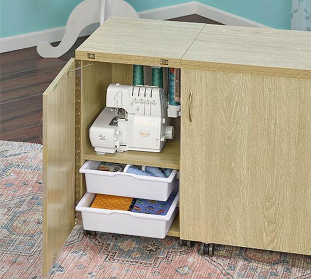 Просторная полка под оверлок: Ваш оверлок надежно закреплен и не пылится, будучи всегда наготове.